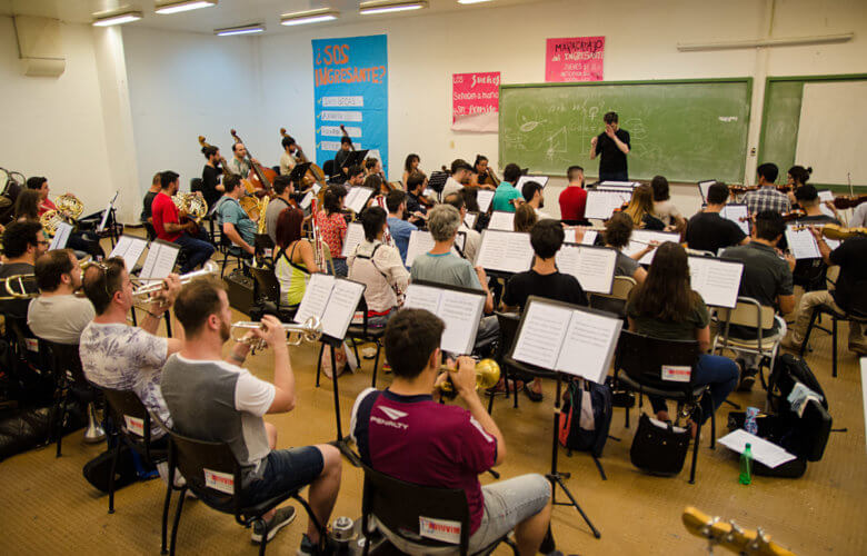 Nosotros tenemos un sistema de 64 becas para completar la orquesta sinfónica, el problema es que en Villa María todavía no tenemos una masa crítica para completar esos espacios y entonces todavía no hemos llegado a cubrirlos a todos. Tenemos alrededor de 47 becas cubiertas y para los conciertos se contratan refuerzos porque la Orquesta Sinfónica es un instrumento acústico que no puede trabajarse con el sonido entonces necesitamos la cantidad de músicos para que tenga el balance y suene como tienen que sonar los arreglos.