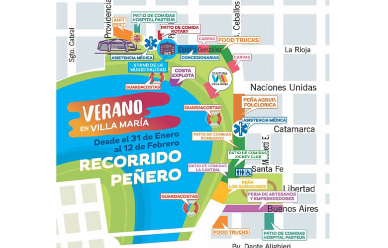 Una vez en avenida Bruno Ceballos, sobre la plazoleta del Ente Villa María Deporte y Turismo, habrá un espacio de food trucks con su propuesta gastronómica y juegos infantiles. Desde ese punto, por la Costanera hacia el Anfiteatro, se ubican la Peña Los Soñadores y los patios de comidas de La Cantina, Jockey Club y Bomberos Voluntarios, junto a stands gastronómicos hasta la intersección con calle Catamarca, donde estará el puesto de atención médica.