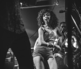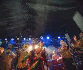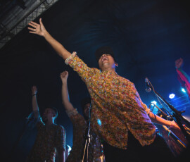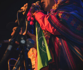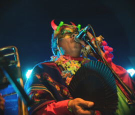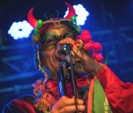 En el marco de la celebración de sus diez años, la orquesta de cumbia La Delio Valdez no dejó de lucir sus mejores hits. La cancioncita iniciaba el espectáculo, ante un público curioso por encontrar de dónde venía la voz de Pedro Rodriguez que, por cuestiones espaciales, quedó lejos de la vista y ante las timbaletas, un poco detrás. Luego, entre numerosas demostraciones de agudeza sonora entre lxs miembrxs del conjunto, Ivonne Guzmán y Black Rodriguez Mendez saltaron sobre el color uniformado de la banda, con sus vestimentas y performances de baile en las canciones más coreadas: Inocente y Negra, Ron y Velas, respectivamente.