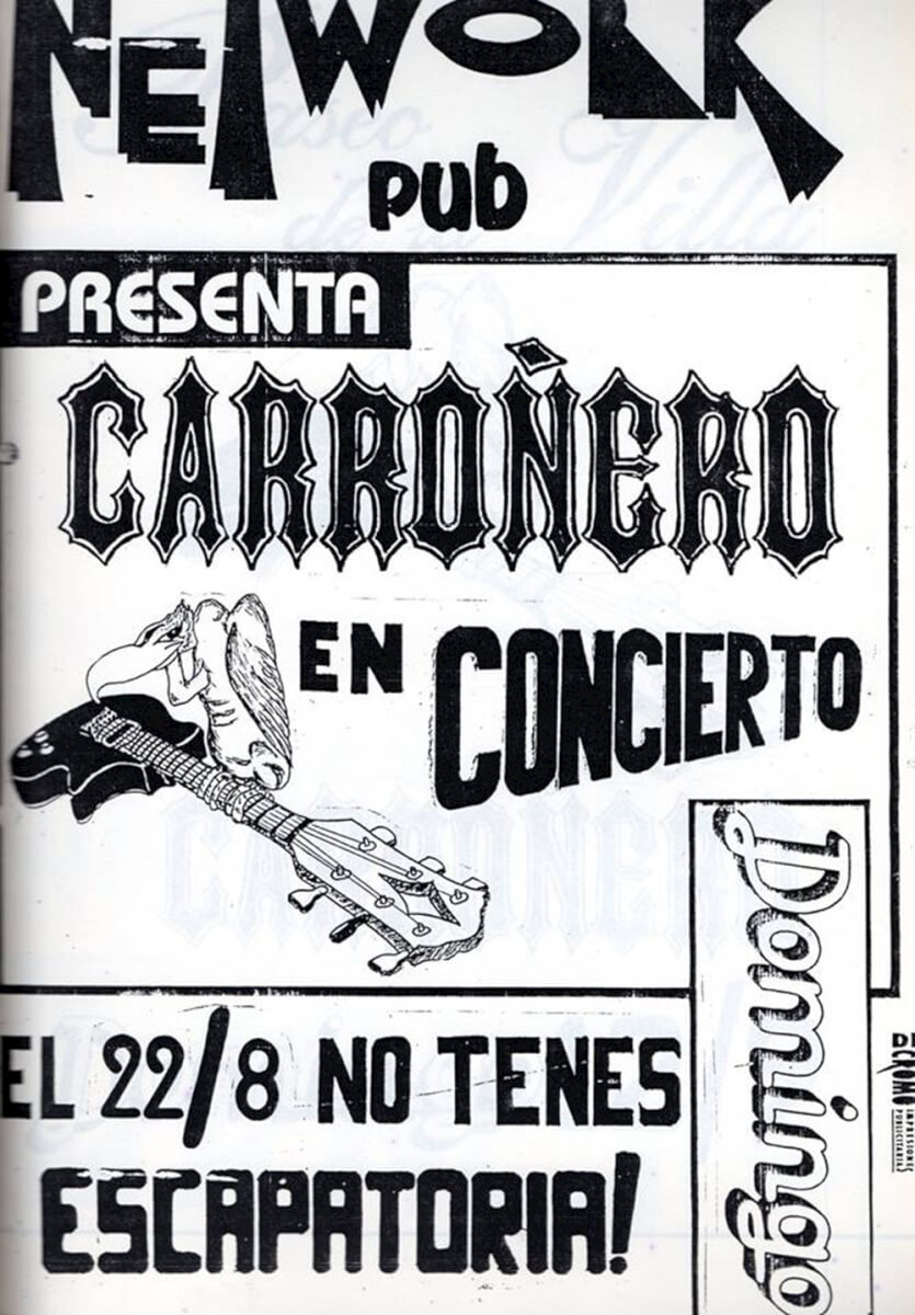 Por supuesto estarán acompañadas y reforzadas por imágenes increíbles de fotos y afiches de la época. Y para comenzar con la serie de reportajes decidí seguir con el primer consejo de José Benítez. Así que Carlos “Pepo” Lucero, actual integrante de la banda OVERDRIVE, nos da a continuación su testimonio y vivencias en Carroñeros, banda que lograba convocatorias de 300 personas o más por show.