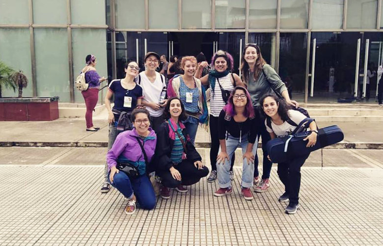 En ese contexto, se contacta con nosotras Carolina Haick, presidenta de la asociación civil Música de Mujeres de Santiago del Estero y egresada de la Lic. en Composición Musical con orientación en Música Popular de la UNVM. En asamblea, se reunió y compartió con nosotras experiencias, sus dinámicas organizativas y nos invitó a participar en el 2do Encuentro Nacional de Música de Mujeres que se iba a llevar a cabo en abril en su ciudad. A partir de esta invitación, el colectivo de músicas feministas empezó a planificar actividades para la autogestión del viaje y para convocar a más mujeres que quisieran participar en las asambleas y del encuentro.