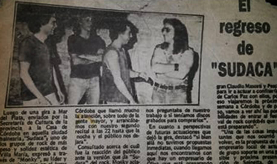 Estoy hablando de 1987 más o menos. No teníamos ni idea de alguna otra persona en la ciudad que escuchara y tocara la misma música, hasta que nos contaron de “Sudaca” y fuimos a un show de ellos en el Club Sarmiento, estábamos en la puerta y apareció Monky y Gonzalo Gómez el guitarrista, los dos con camperas de cuero y grandes melenas. Quedamos impactados, nos hicieron pasar y ver ese show fue algo definitivo, eso era lo que queríamos. La banda la completaban Corto Otoño en batería y Chapa Chamorro en bajo. También fuimos a algún ensayo de “Merlin Classic” donde tocaba Pepo Lucero en guitarra, Kuky Castro el teclado, Cari en batería y el Gato Dupui en bajo.