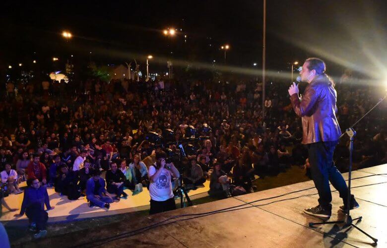 A las 20:02 minutos salió al escenario, casi como si se tratara de una estrella de rock, con un teatrino colmado ovacionándolo. Si, un filósofo llenó tribunas en un espectáculo al aire libre. Pero no se trata de cualquier filósofo, sino de uno joven, poco convencional, desestructurado, divertido, simple y sin vueltas -si es que esto es posible en la filosofía- y con ganas de divulgar el saber filosófico, haciéndonos entender que filosofar no es más que hacerse preguntas.